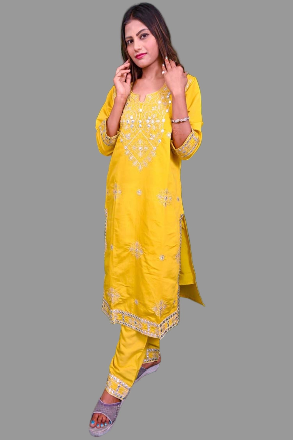 Elevate your festive wardrobe with this yellow kurti set adorned with delicate shimmering silver embroidery. Crafted to blend traditional charm with subtle elegance, its vibrant hue enhances your festive spirit while the silver detailing adds a refined, celebratory touch. Perfect for special occasions, this kurti offers both style and comfort, making it a versatile choice for your festive events.