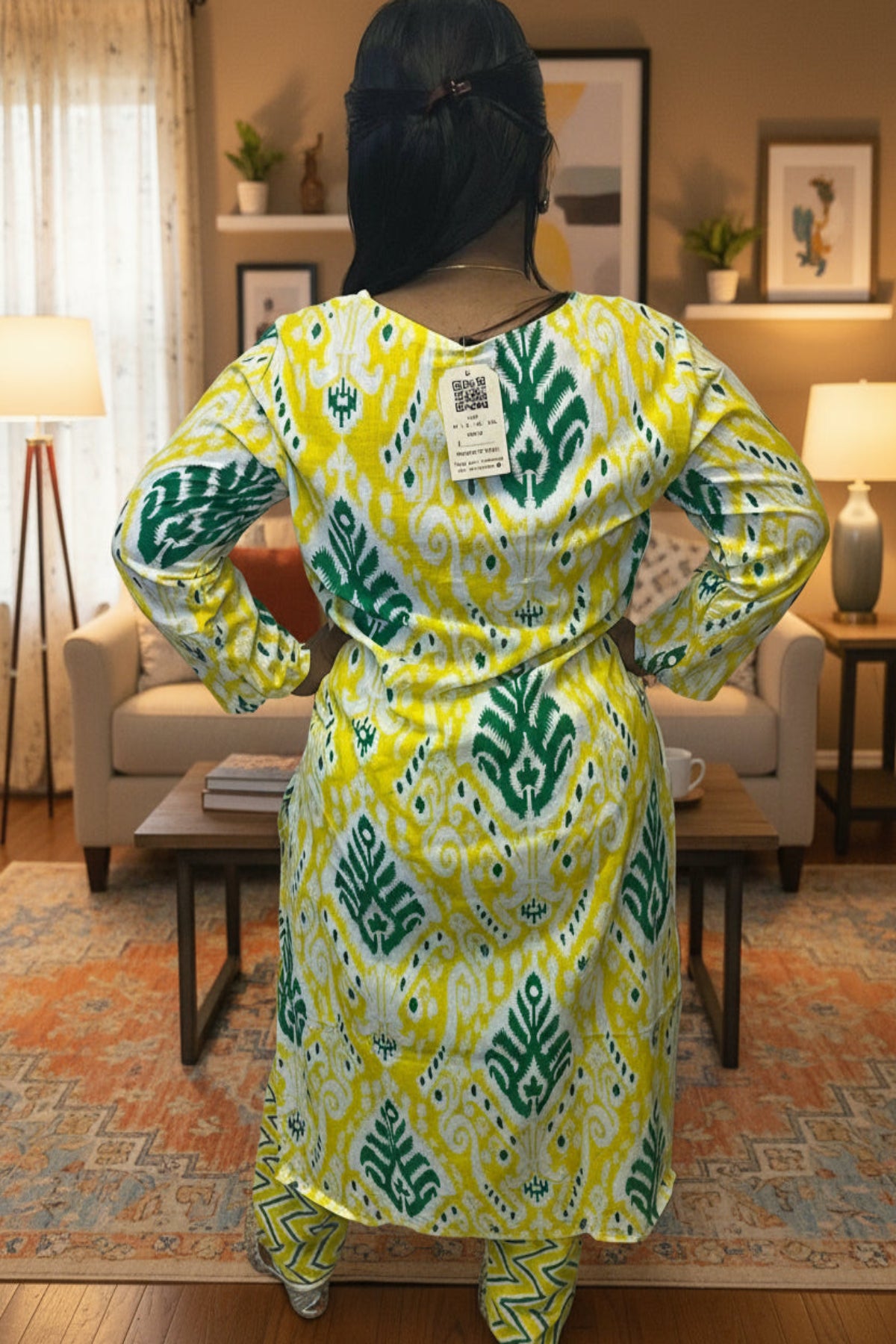 This designer yellow cotton kurti set features breathable fabric for comfort and ease, enhanced by stylish mirror embellishments that add a refined sparkle. Ideal for casual gatherings or festive events, it combines traditional aesthetics with contemporary design for a graceful and vibrant look.